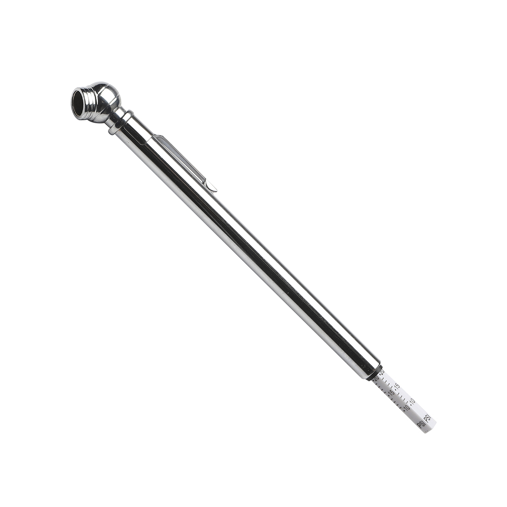 Standard pencil tire gauge includes chrome plated pocket hook.