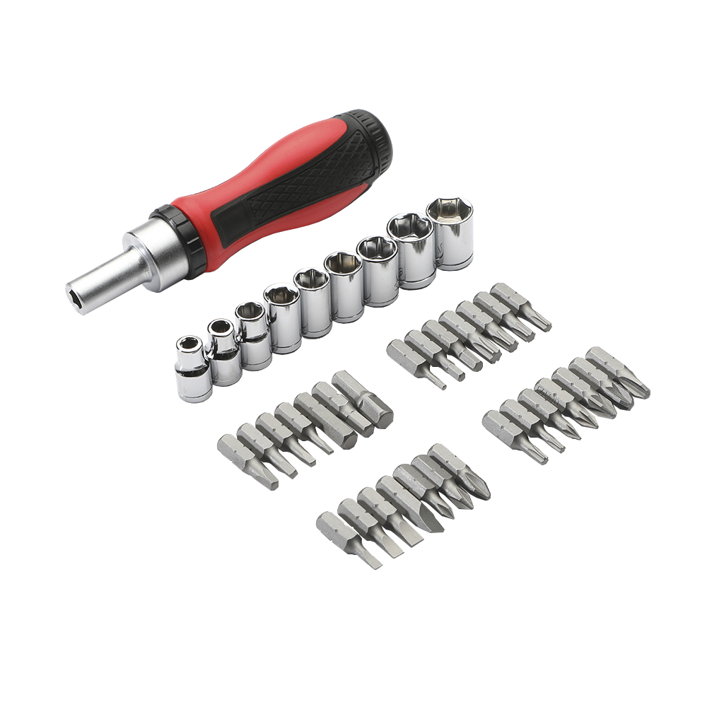 38-piece Ratchet Screwdriver Set includes 9 sockets, 27 bits, and an adaptor.