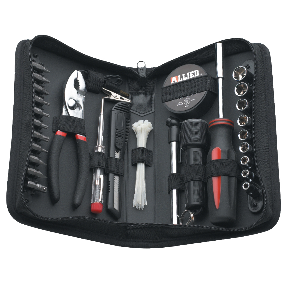 Set also includes mini flashlight, 4" cable ties, 30' electrical tape, 6" slip joint pliers, and a convenient zippered storage case.