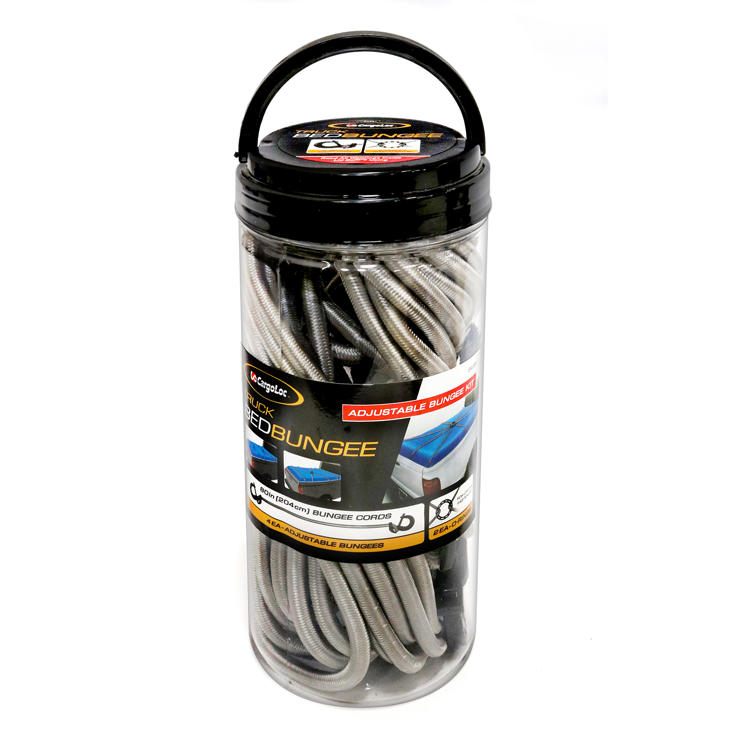 Four 80" adjustable bungee cords with two O-rings to create a secure fit on your load.